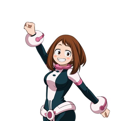 Ochaco Uraraka is a fan-favorite character known for her bubbly personality and her ability to manipulate gravity. Without her pink and white costume, we can see that she's actually quite petite and slender, with a delicate frame that belies her inner strength. She also has long, flowing hair that adds to her feminine charm.