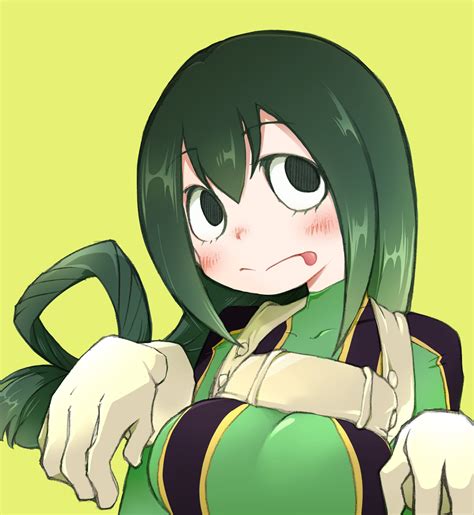 Tsuyu Asui, also known as Froppy, is a popular character known for her frog-like appearance and her ability to stretch her tongue. Without her green and yellow costume, we can see that she's actually quite slender and athletic, with a lithe frame that reflects her agility and speed. She also has large, expressive eyes that add to her cute and endearing image.